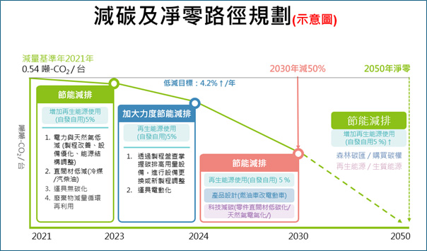 環會協會透過輔導客戶產品碳足跡盤點結果,給予減碳及淨零規劃路徑(如下示意圖):欲達到碳中和結果,除了再生能源等的助益,並與供應商偕手合作,協助客戶達到淨零目標。