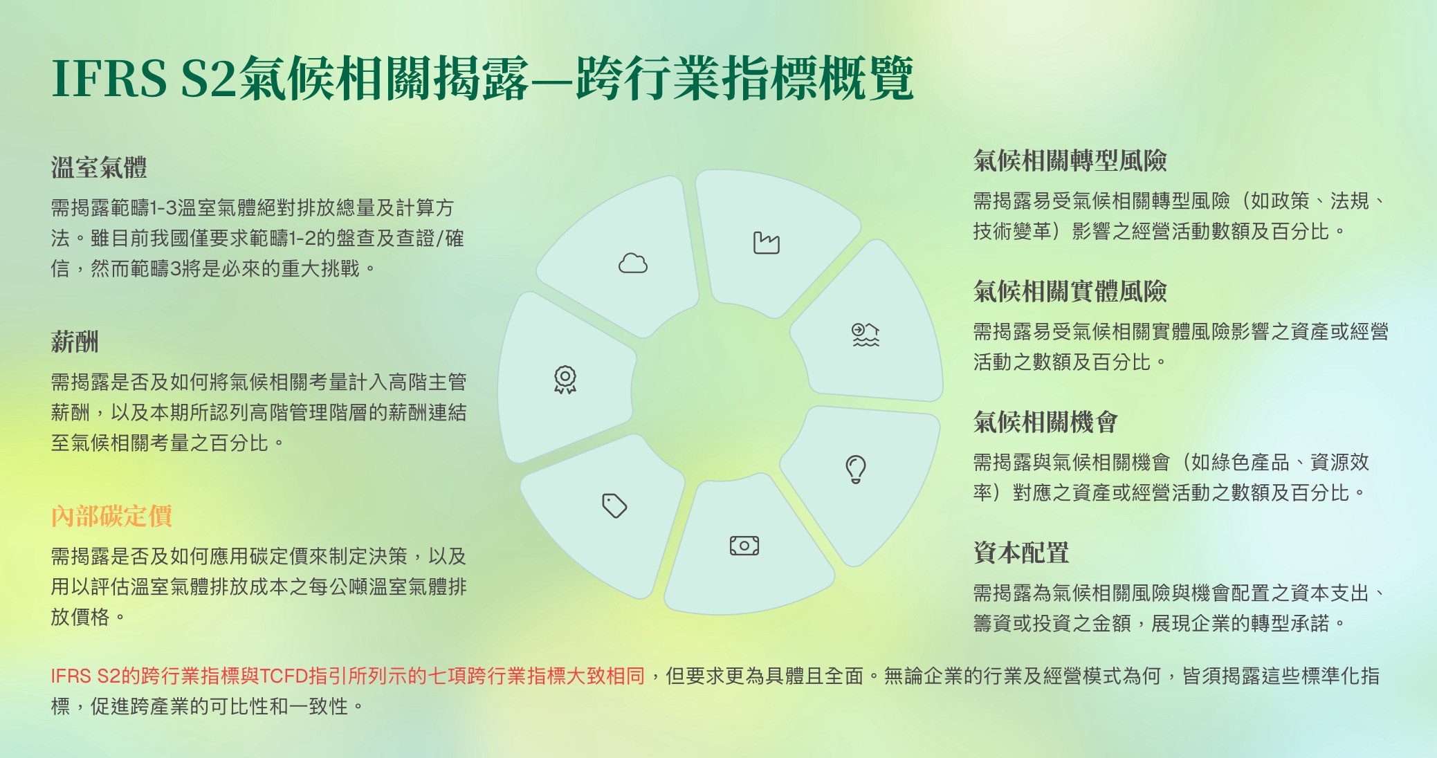 IFRS S2 架構重點涵蓋「治理、策略、風險管理、指標與目標」四大構面,旨在協助企業完整揭露氣候變遷對營運與財務之潛在影響,並強化投資人、利害關係人對企業永續發展能力之信賴。本會多年來深耕環境管理會計與碳管理議題,結合產官學專業資源,已建立完善之輔導模式,協助企業自評現況、規劃制度,並依循國際標準逐步建置符合 IFRS S2 要求之揭露架構。